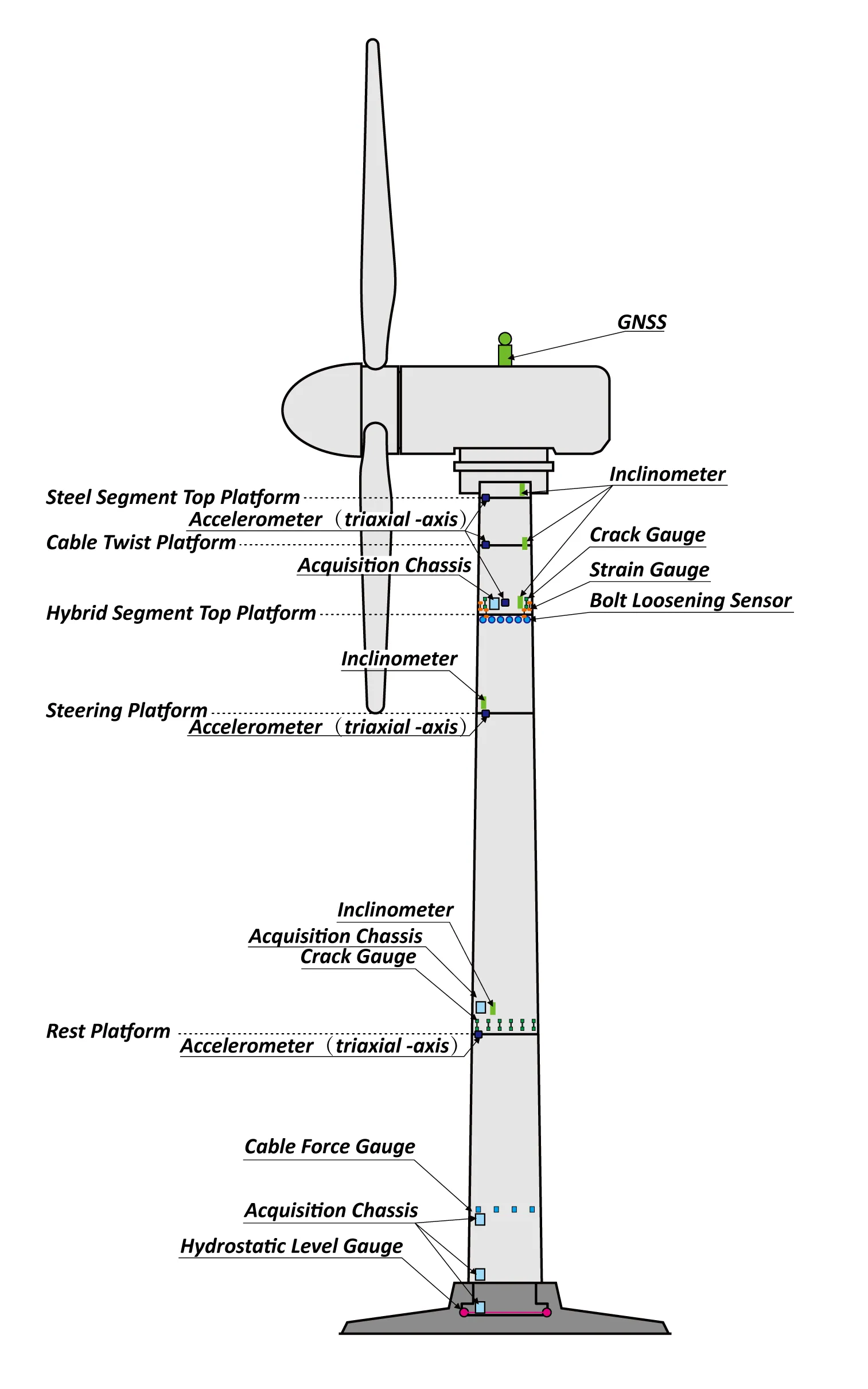 By installing relevant sensors on wind turbine towers for condition monitoring, the main monitoring contents for wind turbine tower structural components should include: tower vibration monitoring, tower inclination monitoring, stress monitoring of the top transition section, tower body crack monitoring, tower displacement monitoring, tower foundation settlement monitoring, cable force monitoring, etc., so as to achieve the goal of safe operation of wind turbine towers.